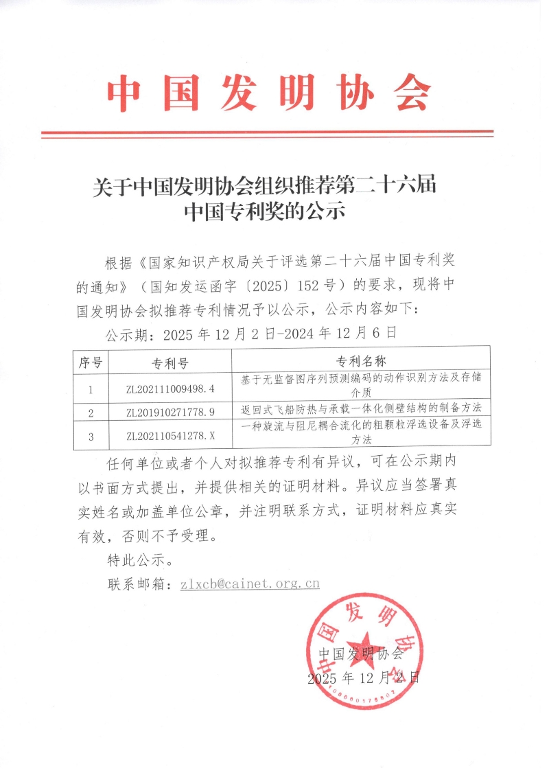 关于 组织推荐第二十六届中国专利奖的公示