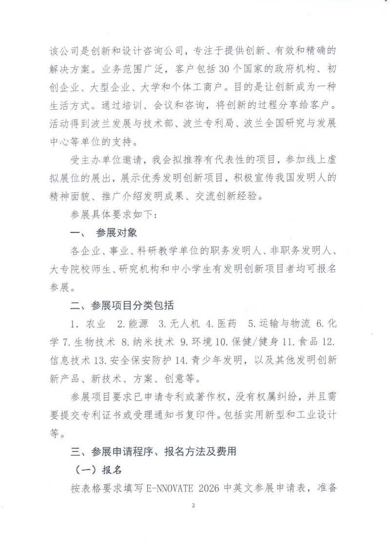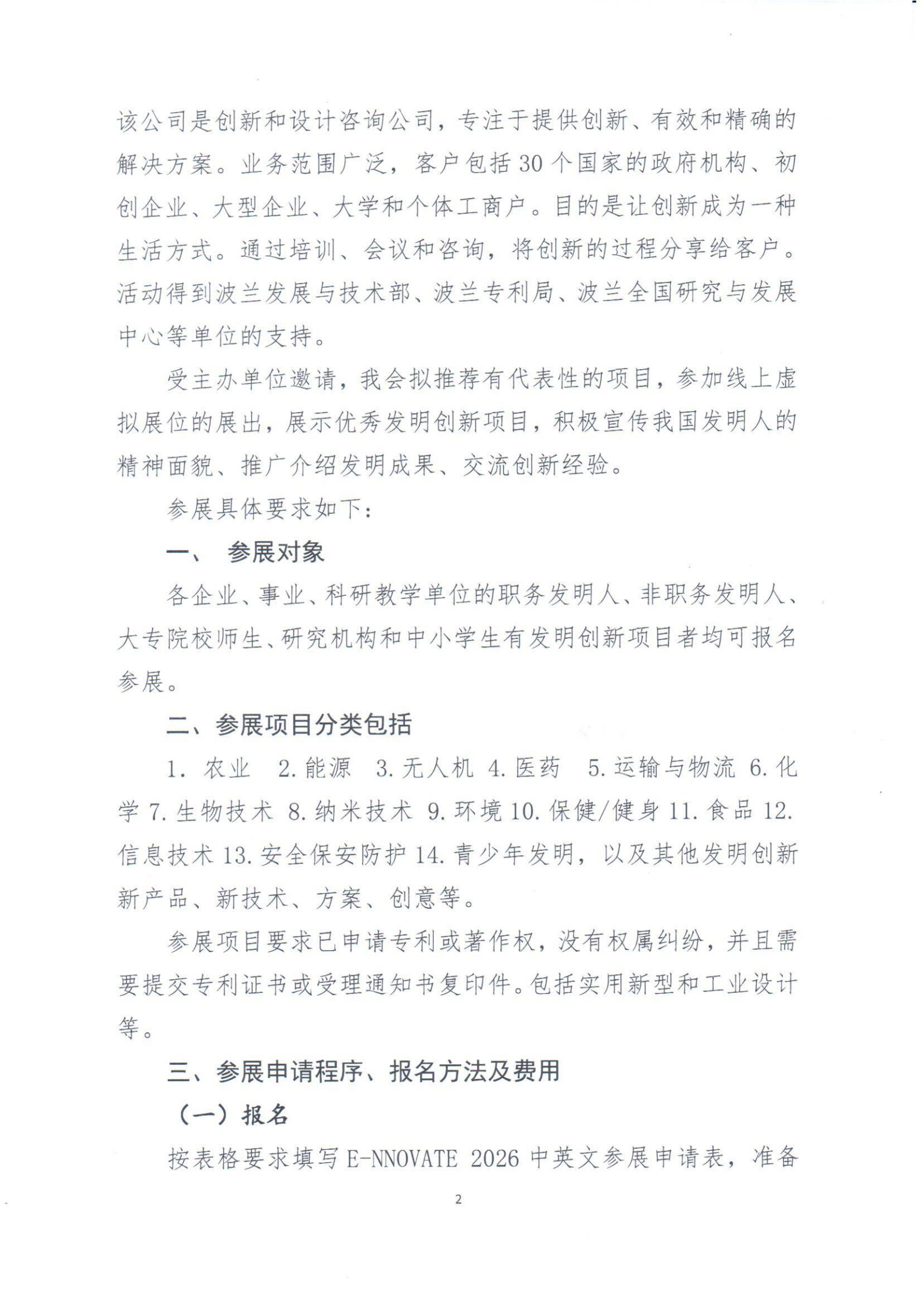 附件1 E-NNOVATE 2026 报名表- app.form.docx附件2 E-NNOVATE2026线上展展板文字图片内容 5.14-15.docx附件3 E-NNOVAT波兰创新展 个人资料表 5.14-15.docx附件4 E-NNOVAT波兰创新展 线上展展位说明 示意图 5.14-15.docx