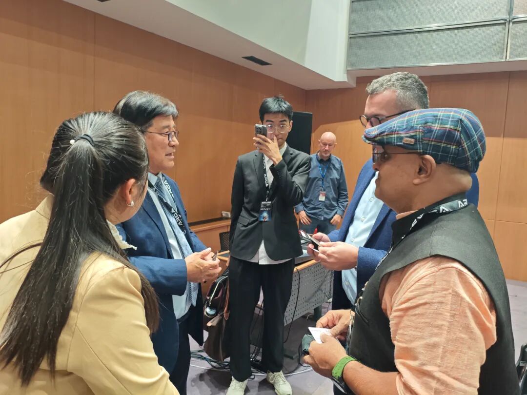 中国代表团成为全场焦点,吸引了各国与会代表的广泛关注。大家热情致意、亲切交谈,现场互动频繁,气氛热烈融洽。